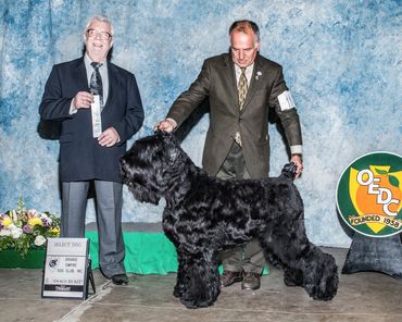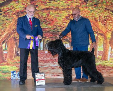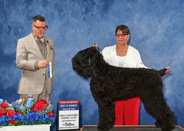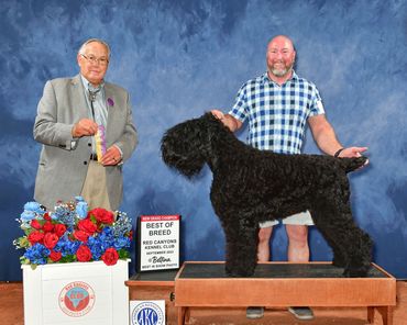 Michael Anthony is truly a Black Russian Terrier. He fiercely loves his family and would protect us with his life. He is affectionate, comical, and happy. Michaele dislikes and distrusts strangers. Once properly introduced, Michael will decide if they are trustworthy. Those he loves will be showered with his affection. He may even sit on your lap. Michael has earned a Register of Merit from the Parent Club and was named the BRTCA's 2024 Outstanding Sire. We are very proud of this boy.